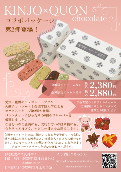 「金城学院大学 × 久遠(QUON)チョコレート」オリジナルコラボパッケージ商品の第2弾登場と販売のお知らせ